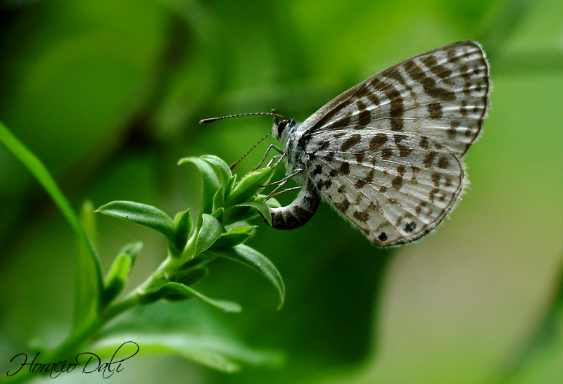Su nombre científico es Leptotes cassius (Cramer, 1775). Es un Licénido subfamilia Polymmatinae, la identificó Lucía del libro de Canals Mariposas de Misiones (P.215), más que obvio que es una hembra..jeje. Tiene conducta de frotado como creo, todos los licénidos.