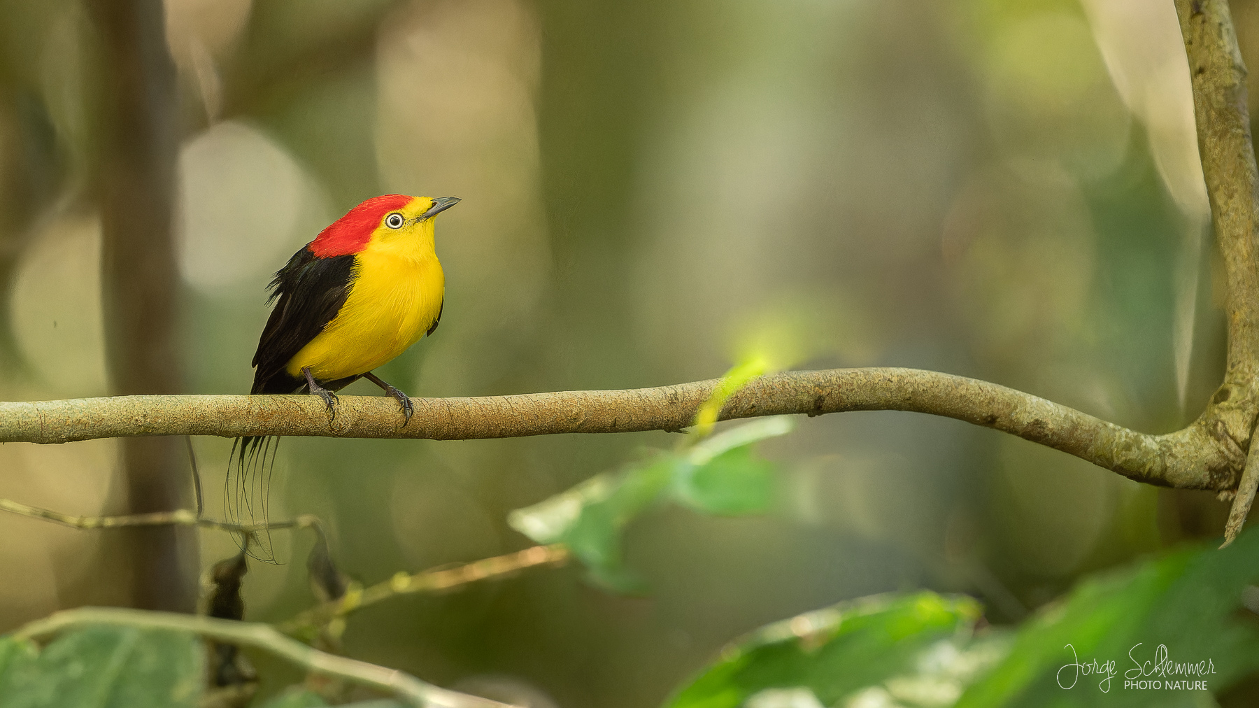 En la foto se ve un macho, su plumaje es amarillo brillante desde la cara hasta la región ventral y rojo brillante desde la corona hasta el manto; el resto es negro.