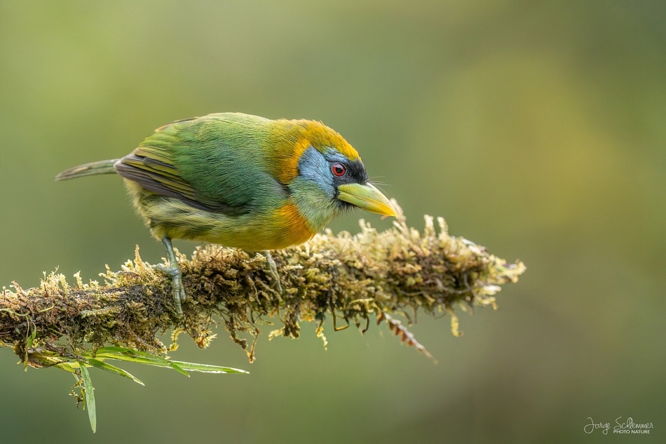 La hembra del Torito Cabecirrojo carece del rojo en su plumaje, pero tiene mejilla azul, lados anaranjados del cuello y frente negra.
