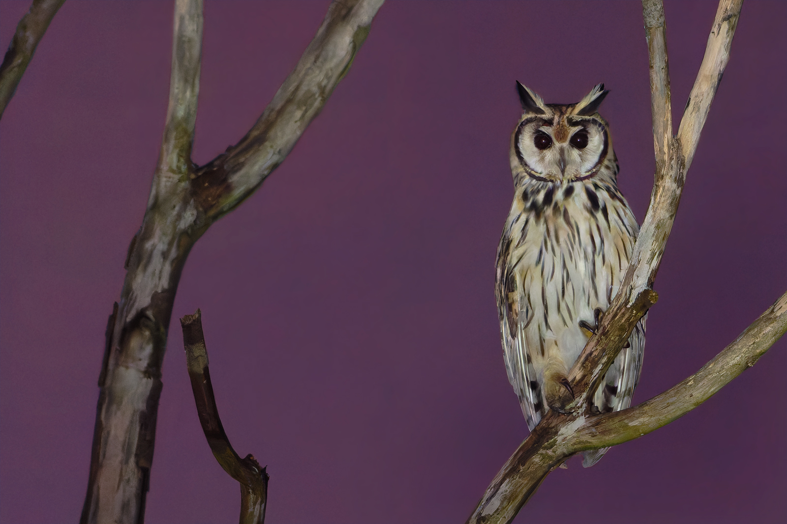 Un Lechuzón orejudo en cercanía de PP Araucaria. El fondo es el cielo hacia el este a 30 minutos antes de la salida de sol. Iluminado con linterna por Naré Berduc. Aunque es una lechuza común en mucho de Argentina, en la sierra de Misiones es escasa (acá es más común Asio stygius), esta foto es el primer registro en la zona desde el 2004.
