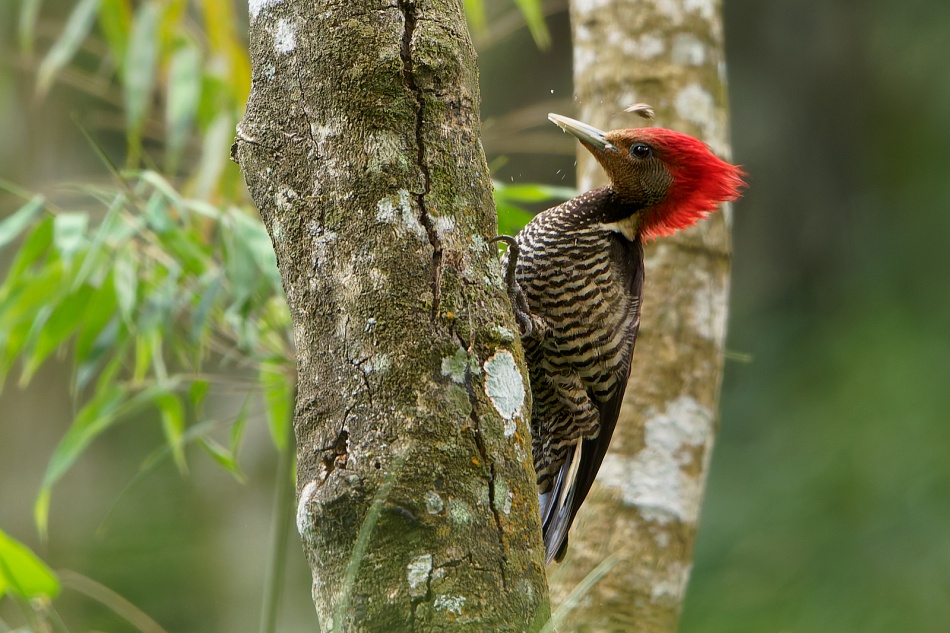 Una hembra de Carpintero cara canela durante su forrajeo, con virutas de madera volando. Estaba sobre un pequeño árbol muerto dentro de un tacuapizal, un sustrato típico para la especies para forrajear, pero difícil de fotear por lo cerrado del ambiente. En este caso oí sus picotazos suaves a unos 15 m de un sendero, me metí de poco a poco en el tacuapizal hasta que la vi, y ahí con mucho cuidado removí unas hojas del bambú que tenía enfrente de mi lente, hasta que por fin la pude fotear durante unos minutos.