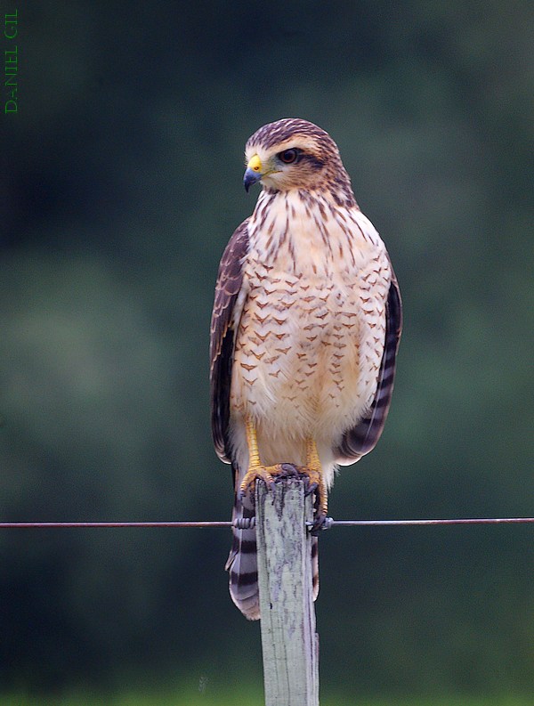 Buenísima la foto, es un juvenil de taguató, Buteo magnirostris, una de las pocas especies de Falconiformes que sobrevive en la región de Chajarí, el uso de agroquímicos por un lado y la caza (le tiran por la creencia brutal de que se comen los pollos o por diversión :twisted: ) por el otro han reducido mucho las poblaciones de estas aves en la zona.