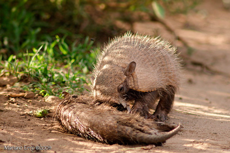 Transitando un camino vecinal, nos detenemos al ver a este Peludo, pero al mirar mejor notamos que estaba comiendo algo. Frenamos a 2 metros y no se movio. Estaba comiendo... a otro peludo!! Si observan bien el peludo muerto fue atropellado por algun auto que paso, y el comensal, oportunista como ninguno, se sirvio a gusto...