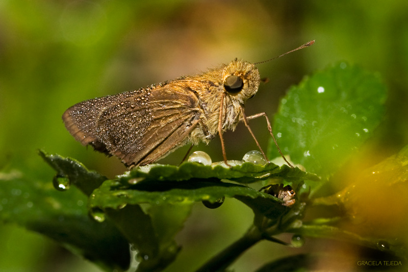 Muy bueno el detalle del rocío en las alas y en las hojas.