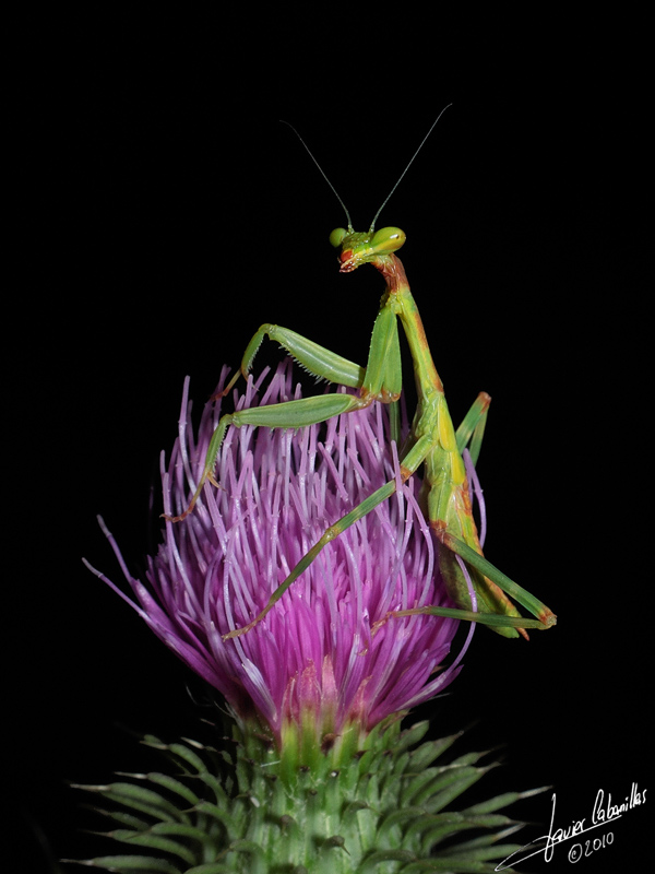 Buenos dias, Subo esta foto viejita, es de noviembre/09. esta mantis estaba atras del asador. estaba persiguiendo una baquita hasta que se apoyo en la parte baja de este cardo, cuando levanto la mirada veo esta mantis debajo de la flor del cardo, como esperando que algún insecto despistado le diera la espalda. Espere un rato “quería verla cazar” pero nunca lo hizo y el sol empezaba a meterse detrás de las montañas, empujándola con el dedo la lleve sobre la flor y le saque un par de fotos. Varias lindas, voy con esta primero