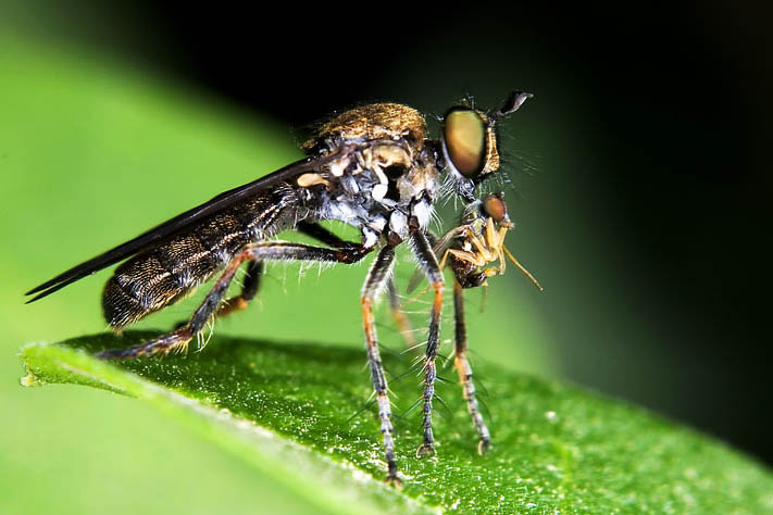 Uhhh espectacular... El grande es un díptero de la familia Asilidae, que en castellano suelen llamarse moscas asesinas. Son unos de mis bichos preferidos y esta foto me encantó. Saludos.