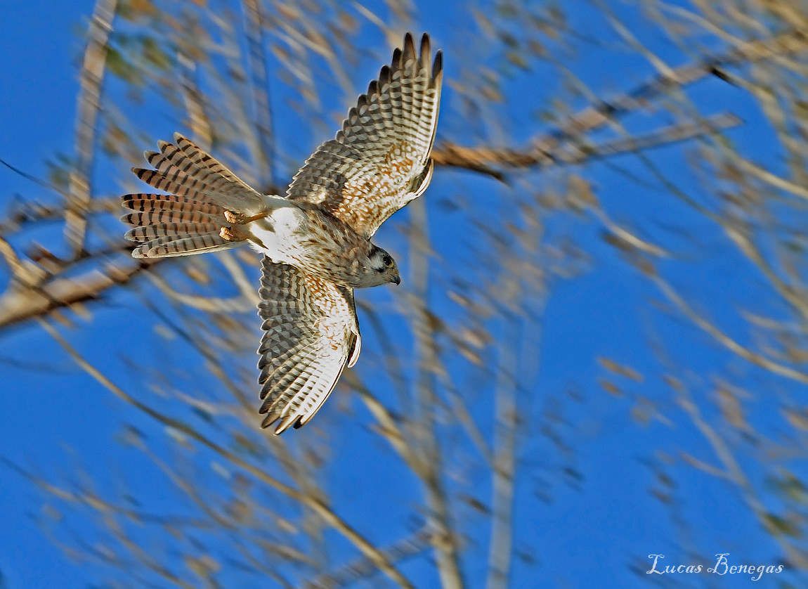 Lindísima foto de una especie hermosa. Me encanta como quedó congelado el halconcito y las ramas de los árboles del fondo parece que estuvieran en movimiento, me dan sensación de velocidad.