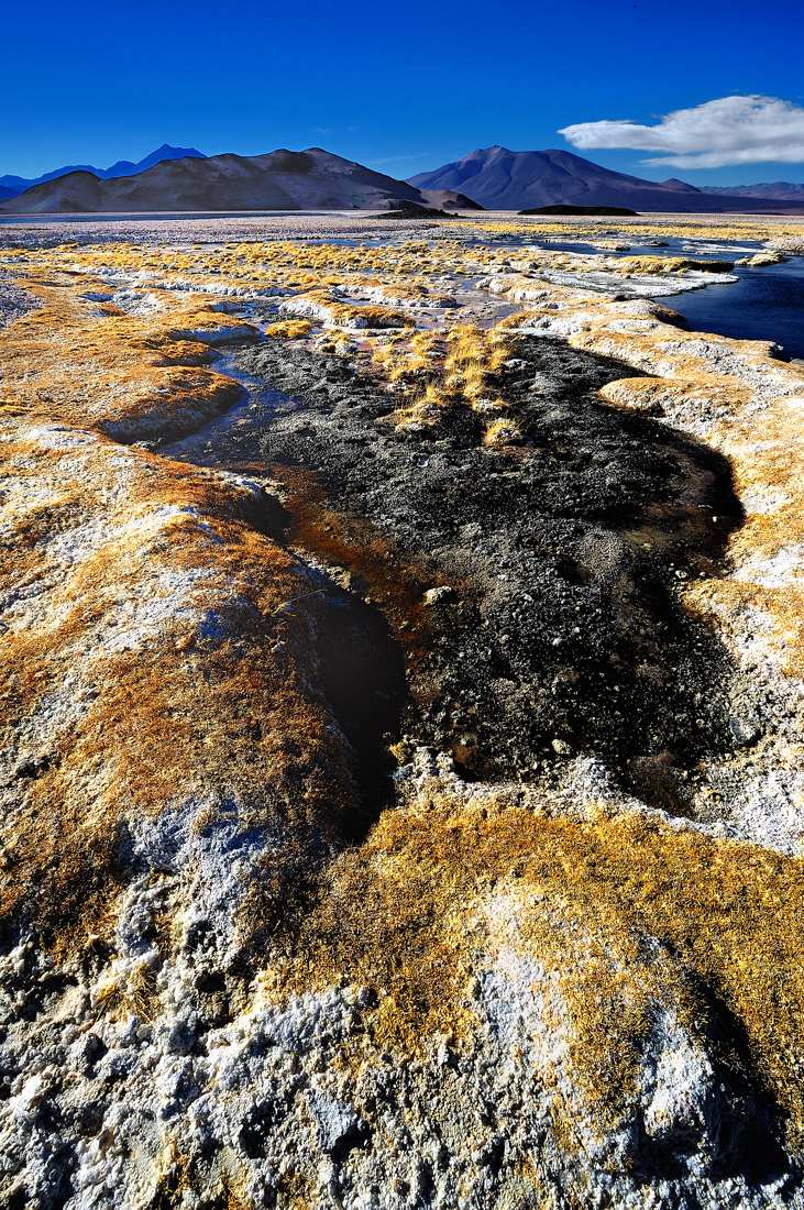 Pertenece al Salar Llullaillaco, las otras dos fotos eran apaisadas, en este caso la hice en vertical para mostrar un poco ese extraño piso mezclado de pastos hyro con las brotando del piso y el agua que tiene ese color casi negro.