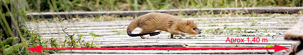 | Hola Diego! Mis estimaciones es que el cuerpo de la Zarigüeya -sin incluir la cola- medía 30 cm. Acá te dejo unas fotos que muestran eso. El corredor del mirador mide 1,60 cm, pero como había dos filas de maderas sobre el costado, eso se reduce a 1,40 (el ancho lo tenía medido del informe sobre los miradores. Se puede confrontar esta info en: http://www.siyc.com.ar/fotonaturaleza/miradores/mirador6.php ).