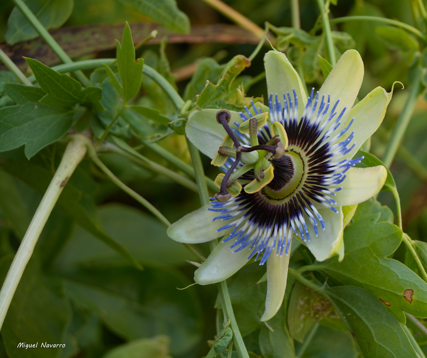 Como dijo Diego se la conoce como pasionaria y también como mburucuya y su nombre científico es Passiflora caerulea. Hermosa foto Miguel con un excelente foco que por el volumen de la flor es muy difícil. Felicitaciones y saludos