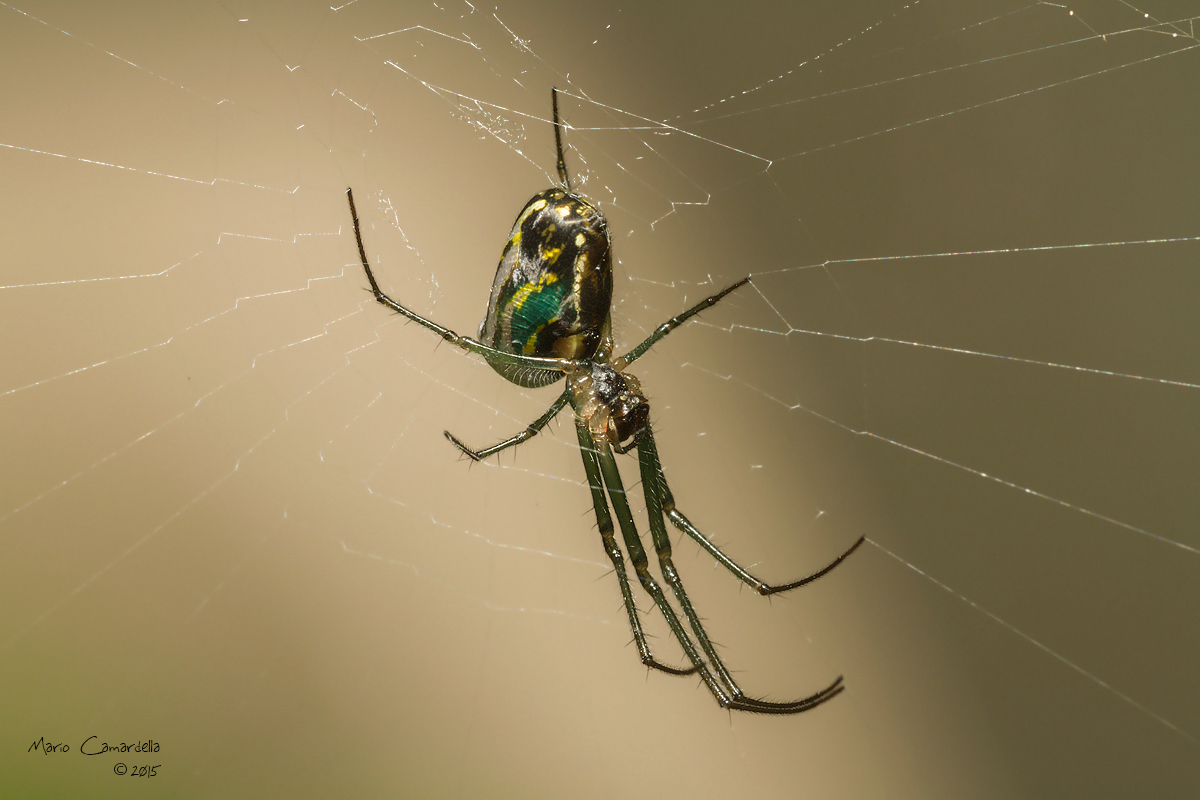 Tremenda calidad Mario, bien mostrado su abdomen con esos verdes y amarillos ! La especie es de las mas vistosas que se puden ver en los jardines, se la conoce como araña del huerto (Leucauge venusta).