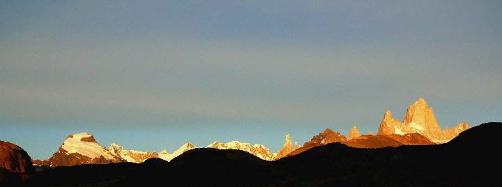 Bueno , la foto es la excusa para agradecer, es chica porque esta recortada, refleja como empiezan a iluminarse los cerros , en aquel inolvidable amanecer en el Chalten, y la subi porque es el resumen de otras fotos que comparti con ustedes. Alli se observa a la derecha el Fitz Roy, casi al centro el Torre y bien a la izquiera el cerro Solo.