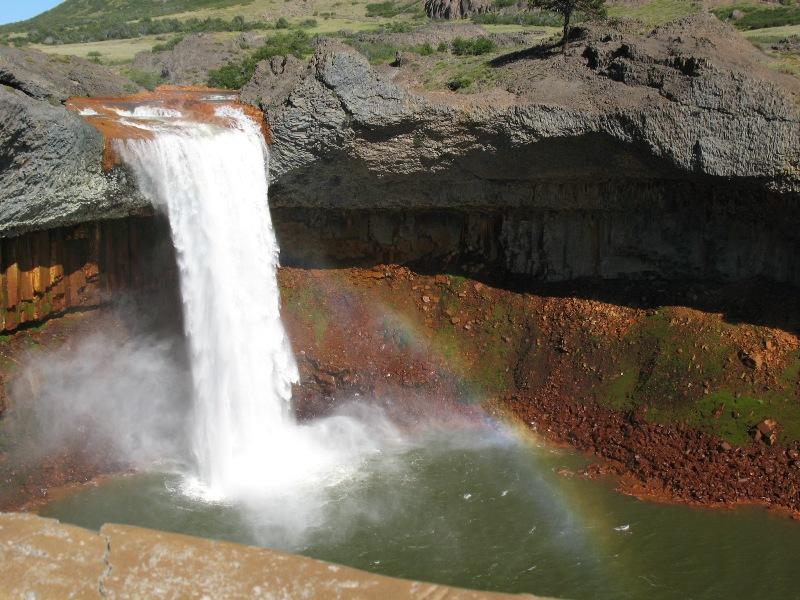 Es un salto del río Agrio, que nace en el volcán Copahue y sus aguas traen minerales, de allí los colores. Está sacada en horas de la mañana, lo que nos permitió ver el arco iris que se forma.