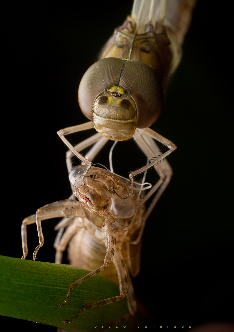 Esta escena es algo que buscaba desde hace tiempo, por suerte hace unos dias se me dio la posibilidad de encontrarme con una libelula en esta situacion en que abandona la vieja piel de ninfa acuatica y asoma el individuo versión adulta.