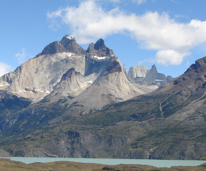 Foto de Torres del Paine y los cuernos del Paine en primer plano, en estos se pueden ver las distintas capas que los componen, es una vista desde el mirador del lago Nordenskjold, que aparece abajo en la foto.