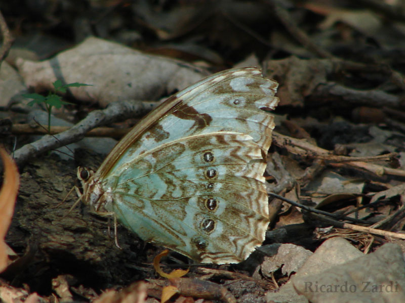 Recorriendo un arroyo de Entre Rios, bajo una espesa arboleda me encontre con este gigante blanco. Es una Morpho caternarius argentina o Morpho epistrophus argentina y tiene mas de 10cm de envergadura. Se la cita en Misiones hasta Punta Lara, Bs. As. Particularmente la he encontrado solo en ER. Su faz dorsal es blanca con un ligero tono celeste. Es sorprendente verla volar y repentinamente desaparecer a pesar de su tamaño y color.