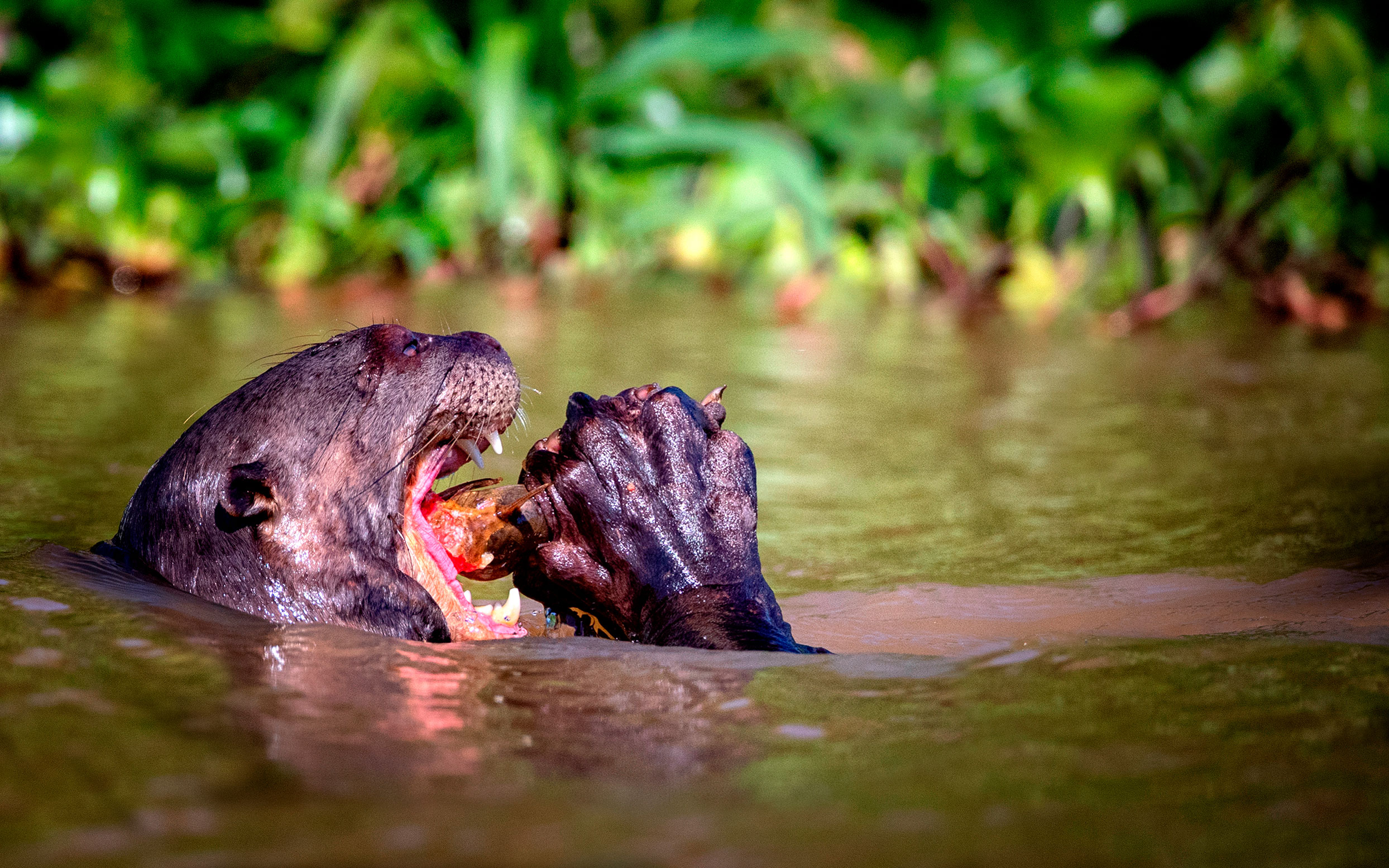 un verdadero espectáculo de cine ver comer a la nutria gigante en Pantanal.