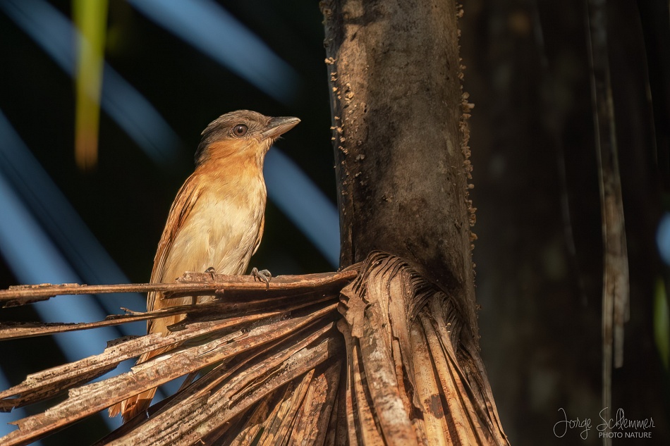 Los anambés (Pachyramphus) tienen cabezas relativamente grandes y picos pesados, y se asemejan a los tiranos atrapamoscas (Tyrannidae).
