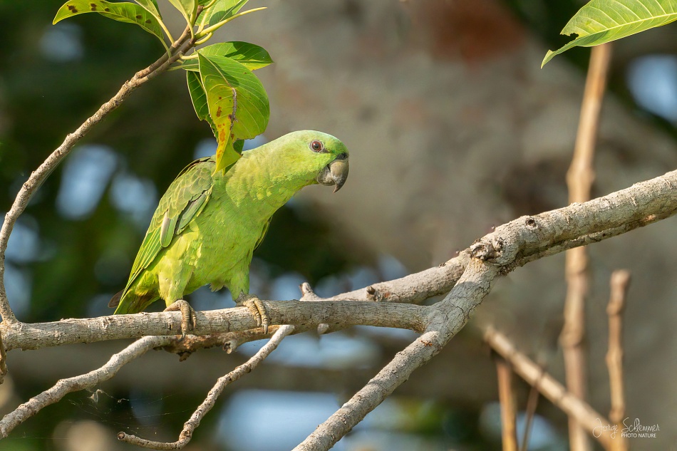 El Curica-verde es un loro de tamaño mediano, de color verde brillante uniforme y su características mas notables son su cola corta y los ojos rojo-anaranjados.