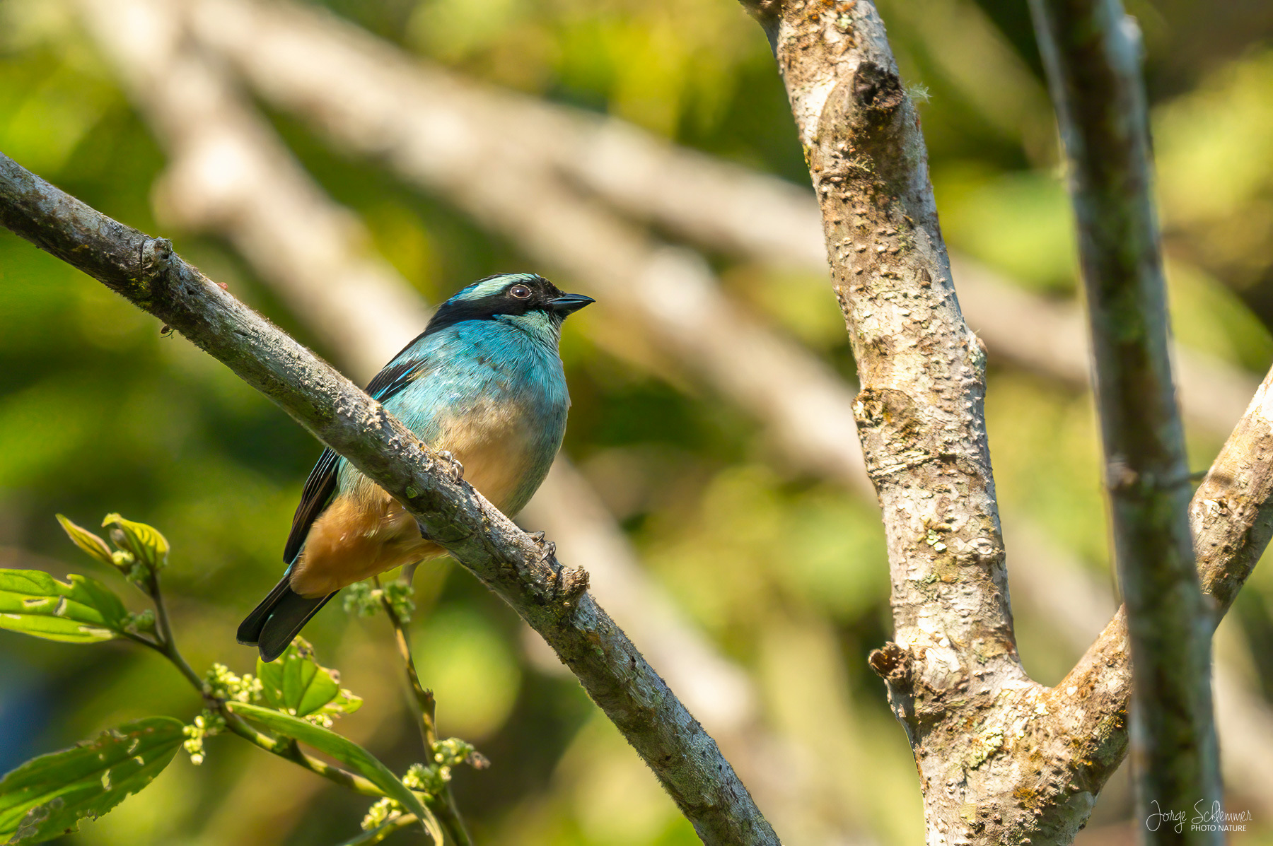El plumaje es negro y turquesa con una llamativa ceja azul y el vientre color durazno.