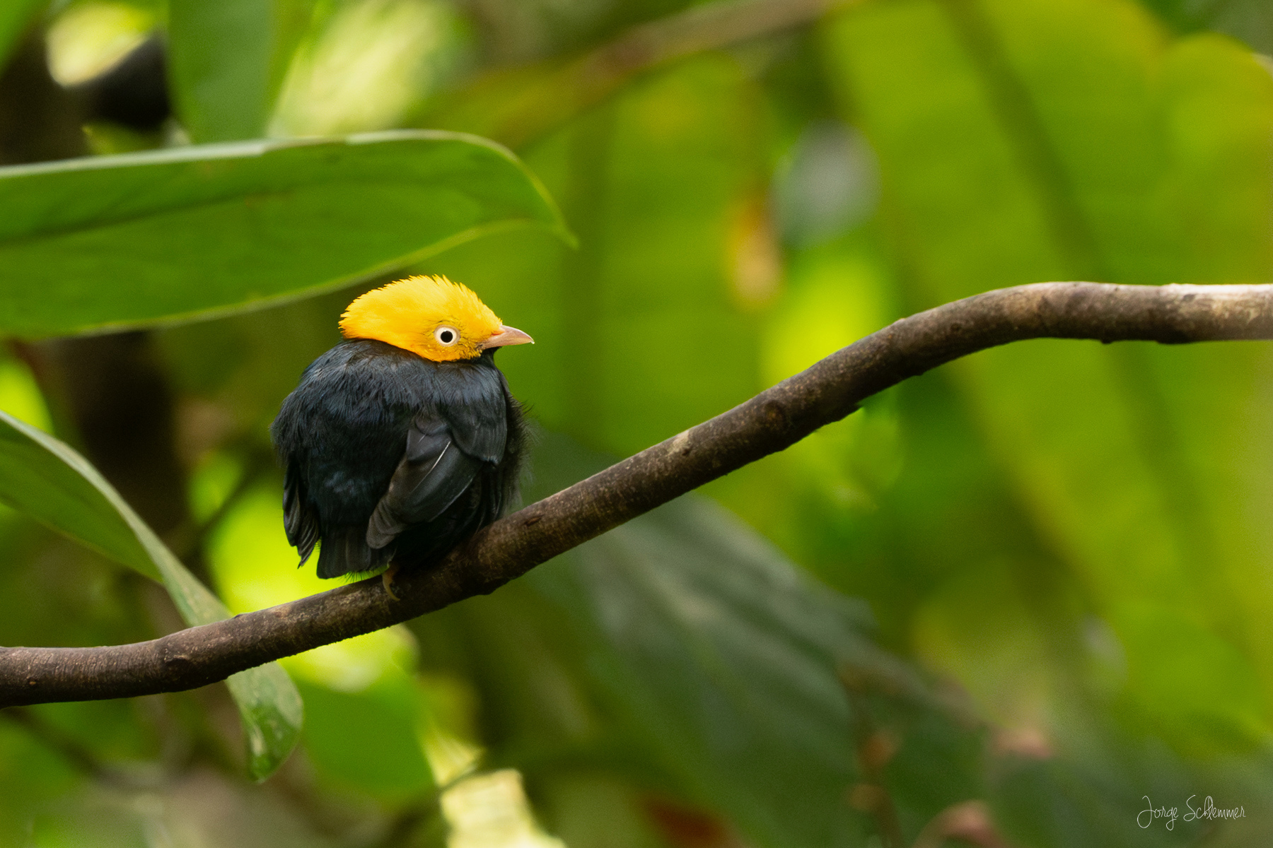El macho es muy llamativo por su cabeza dorada que contrasta con su cuerpo negro; las hembras son de un color verde opaco, como en muchas especies de bailarines.