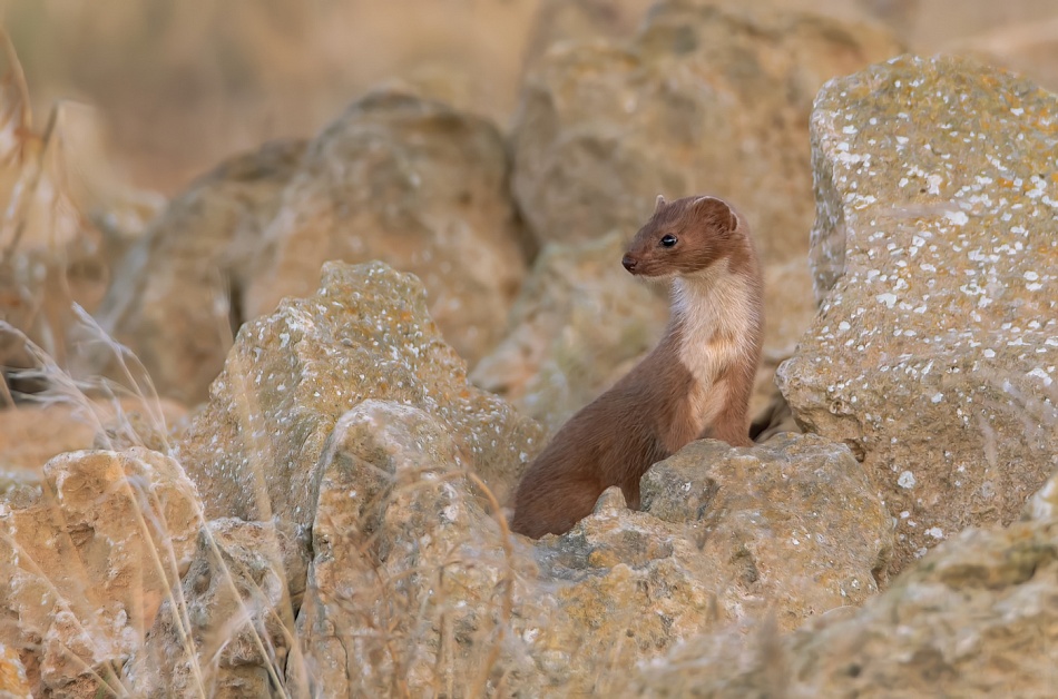 La comadreja menor propia de eurasia , norteamerica y norte de africa, es la especie mas pequeña de los mustelidos. es muy dificil de ver y fotografiar , en esta oportunidad con un amigo en menorca ,que todavia no la pudo fotear ,la fuimos a buscar a punta Naty en menorca ,sin suerte al principio , desp de caminar bastante vi que a lo lejos algo oscuro entre las piedras , era el bicho que se asomo unos instantes , vive adentro de monticulos de piedras y cuevas , pude acercarme un poco y poder fotearla , una gran alegria . Este animal es de tamaño pequeño , un gran cazador que puede abatir presas de entre cinco y dies veces su peso .Punta Naty faro noroeste comadreja menor -mustela nivalis