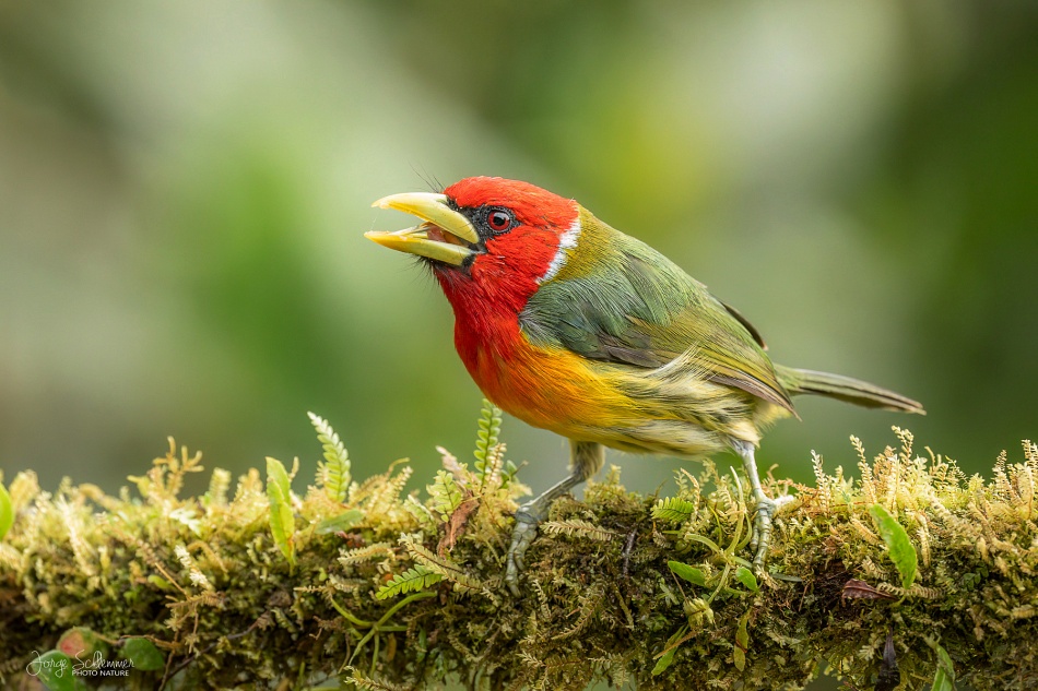 El macho de Torito Cabecirrojo es inconfundible, con su cabeza roja brillante, espalda verde, vientre amarillo y pico amarillo grueso es un festival de color para los fotógrafos de aves.