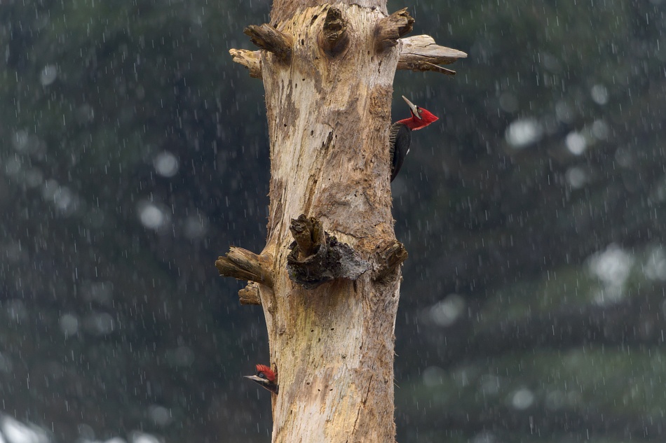 El ultimo día de agosto encontré un nido de carpintero grande a solo 800 m de mi casa, lo que me daba muchas oportunidades de fotos en los ocho días siguientes hasta que el pichón voló. Acá se ve la hembra adulta afuera y el solo pichón, una hembra, mirando afuera, en la lluvia. Foto desde carpa escondite. Les voy a mostrar varias fotos más de la serie.