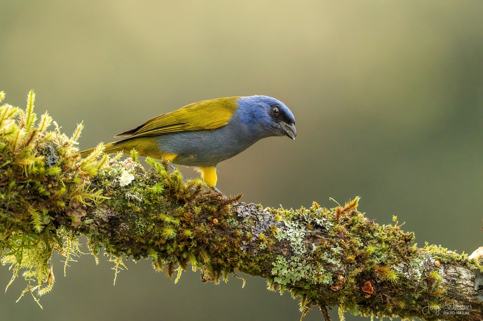 El Azulejo Montañero es un tangara bastante grande, con sus partes superiores de color verde oliva brillante, la cabeza azul brillante, que contrasta con una máscara negra (en algunas subespecies), y las partes inferiores azul grisáceo, realzadas por el plumaje tibial amarillo.