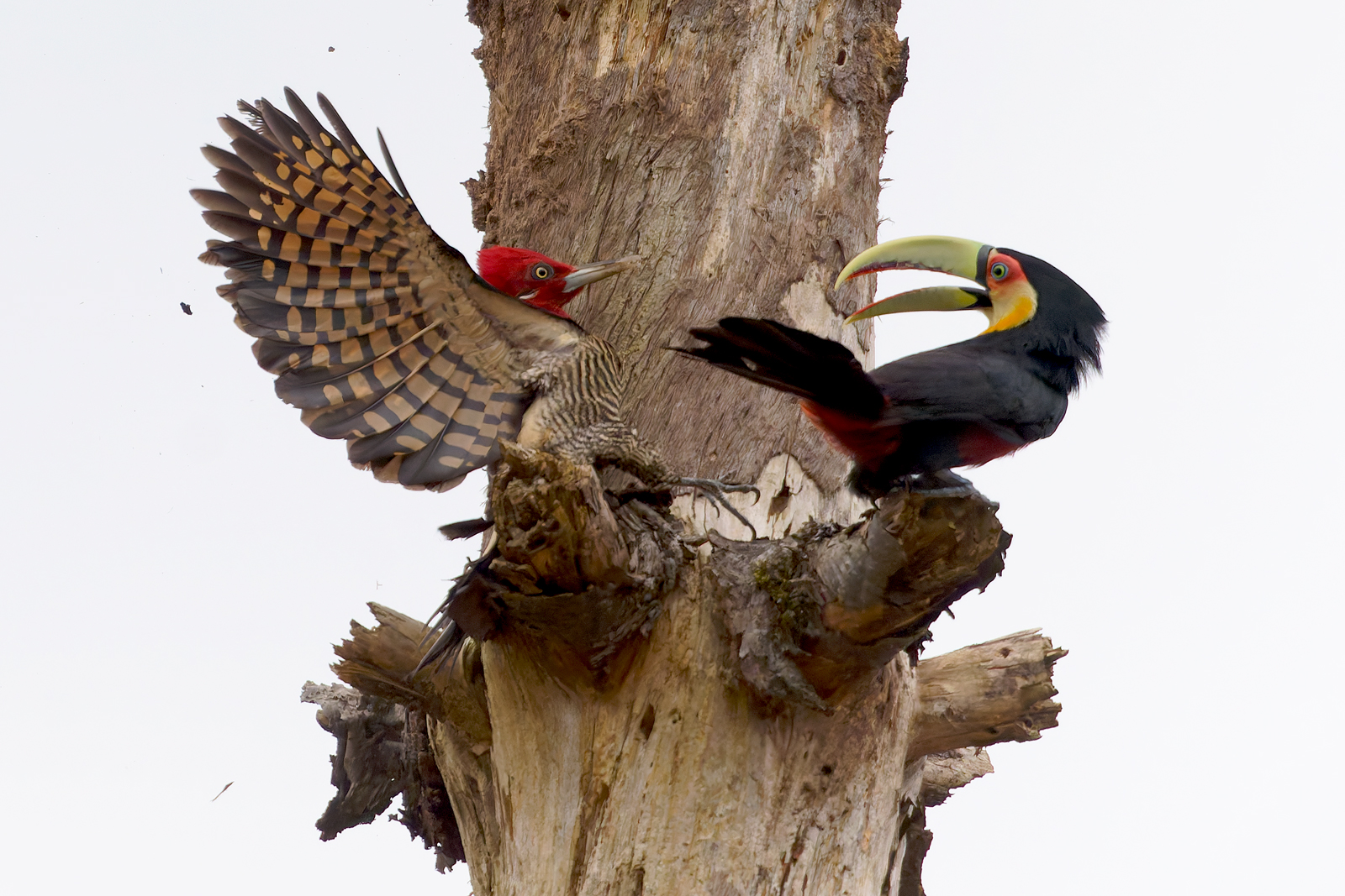 Un macho de Carpintero grande corriendo un Tucán pico verde de la cercanía de su nido. Hemos visto varias ocasiones de depredaciones de nidos de Carpintero grande por Tucán pico verde, por suerte este macho era valiente y su pichón voló exitosamente.