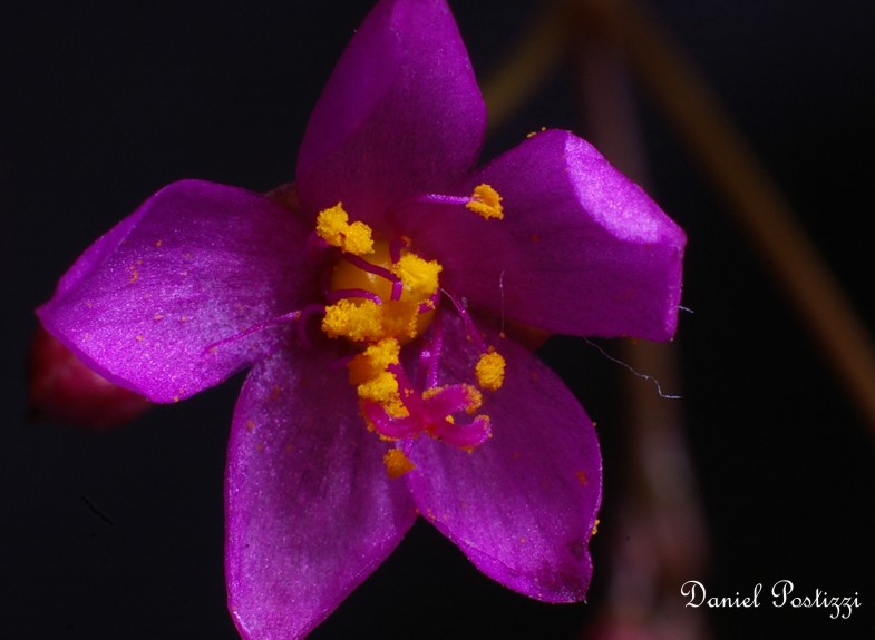 Esta flor, también es desconocida para mi, una planta muy baja despliega un ramillete de estas flores rojas, y cada una , mide 8mm como máximo, mi interés, simplemente fue practicar un macro y llegar hasta el polen, por el momento les acerco esta aproximación