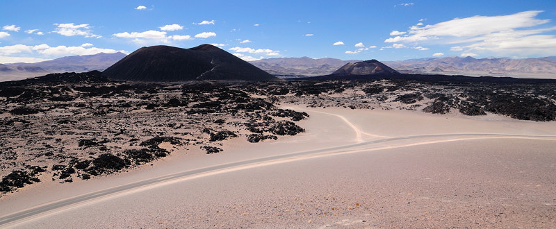 Todo lo que se ve desparramado en cercanía de los dos volcanes son rocas basálticas producto de erupciones que han sucedido cientos de años atras, es por esto del negro intenso de ellas.