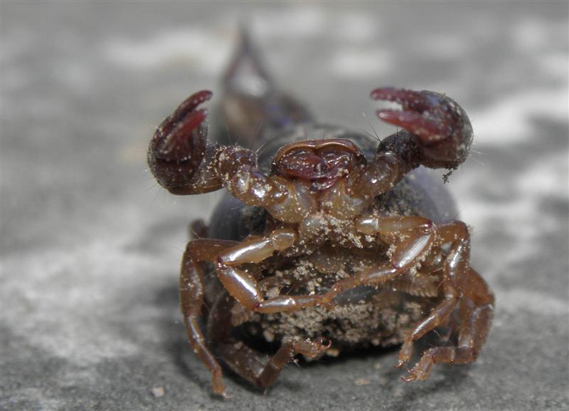 Roxana, me parece que lo que encontraste es un ALACRAN , los alacranes son familiares directos de los escorpiones y habitan en Argentina, les encanta comer grillos y cucarachas, son venenosos pero no tanto como para matar a un humamo. Espero te sirva mi comentario. Saludos.