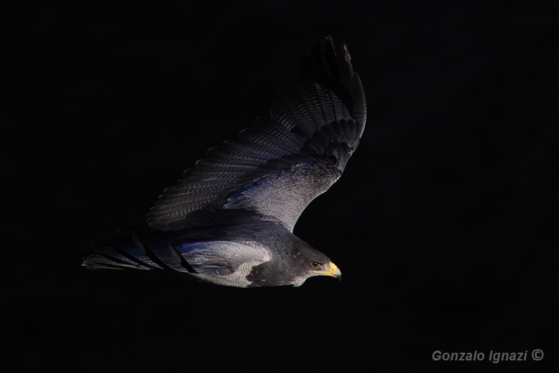 Hola a todos. Esta es un Águila Mora (Geranoaetus melanoleucus) volando sobre el rìo limay, cerca de Bariloche. El fondo se encuantra totalmente subexpuesto y el águla recibía de lleno el sol de la tarde. Tengo cierta debilidad por este tipo de fondo, ya que resalta mucho el objeto principal en la foto.