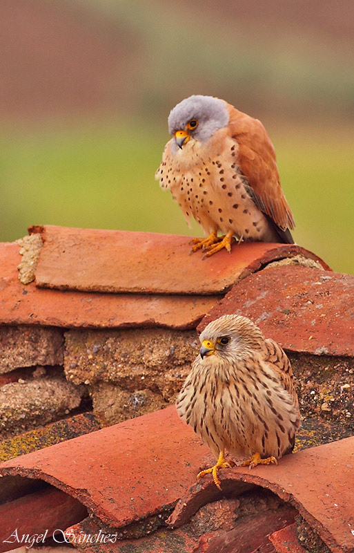Se trata de una pareja de Cernícalos primillas (Falco naumnni) una de las dos especies de Cernícalos de la España, el otro se llama Falco tinnunculus, y es más grande y fuerte que el primilla, por eso creo que evolucionó habitando bajo las cubiertas de los tejados humanos, así tenía mayor defensa, pero en los años 50 del siglo pasado, los plaguicidas, ya que se alimenta de saltamontes y los disparos los diezmaron sus poblaciones, hoy se recupera lentamente. El macho en segundo plano es espectacular, les prometo foto de detalle.