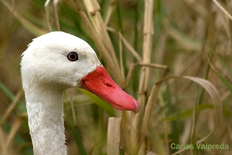 Desde la vereda al borde de la laguna tenía cerca a una pareja de Coscoroba, se ocultaron detrás de un pastizal y sólo asomaban el cuello para curiosear los alrededores, aprovechando la cercanía le tomé varios retratos, este es uno de ellos.