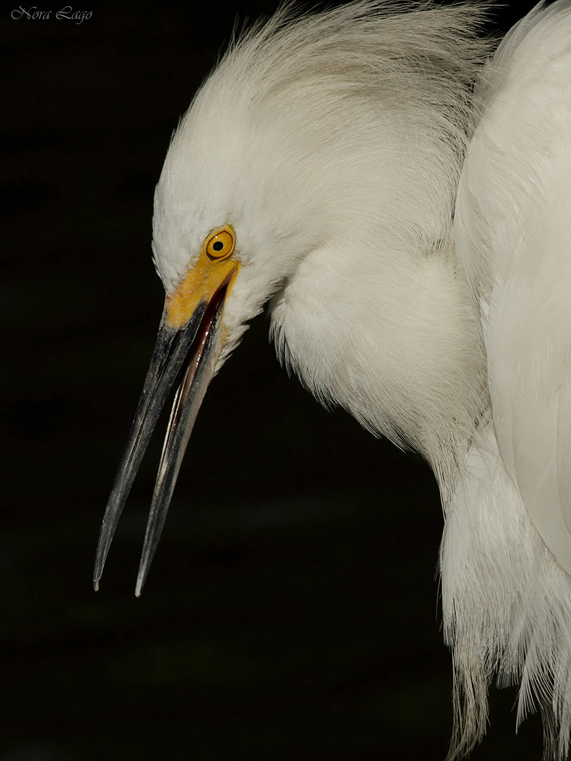 Muyyy buena Nora, a mi me gusta mucho el fondo negro, solo le dejaria un espacio mas por arriba , para que no corte justo las plumitas del egrete. SALUDOS