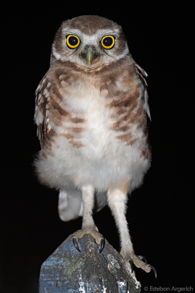 Una noche viajando solo por la ruta 74 que une Madariaga con Las Armas, me cruce con esta Lechuza sobre un cartel en la rotonda que esta a la llegada a Madariaga. El lugar esta iluminado. No pude con mi genio, pare el auto, abrí el baúl, arme la cámara y me volví al auto, puse mi bean bag (que en vez de bean rellene con lentejas) en el marco de la ventana. Me acercaba con el auto a la lechu y esta volaba a otro cartel del otro lado de la rotonda asi que…………..me pase jugando a la calesita en la rotonda un buen rato por suerte no había ni trafico ni nadie cera para matarse de risa. La lechu iba y venia de un lado la otro de la rotonda y cada aproximación llegaba mas cerca. La imagen casi no tiene recorte, un mínimo para reencuadre, como verán 310 Mm, me dejo acercarme mucho. Mi idea era lograr acercarme lo suficiente para que el flash iluminara bien con un f 7,1 para lograr buena iluminación y también buena definición.