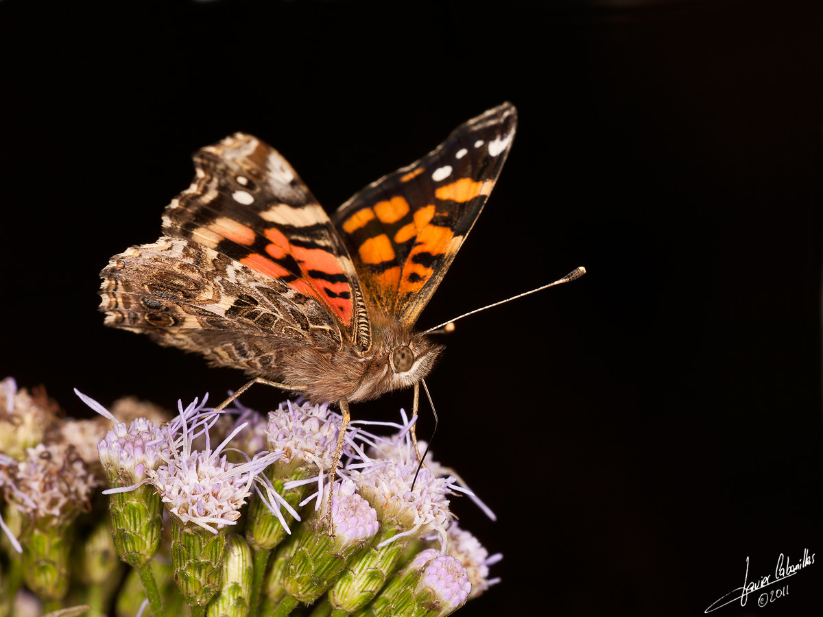 una composición de maravillas, excelente foto!!! esos tonos, la mariposa, y ese fondaso negro muy buenos.