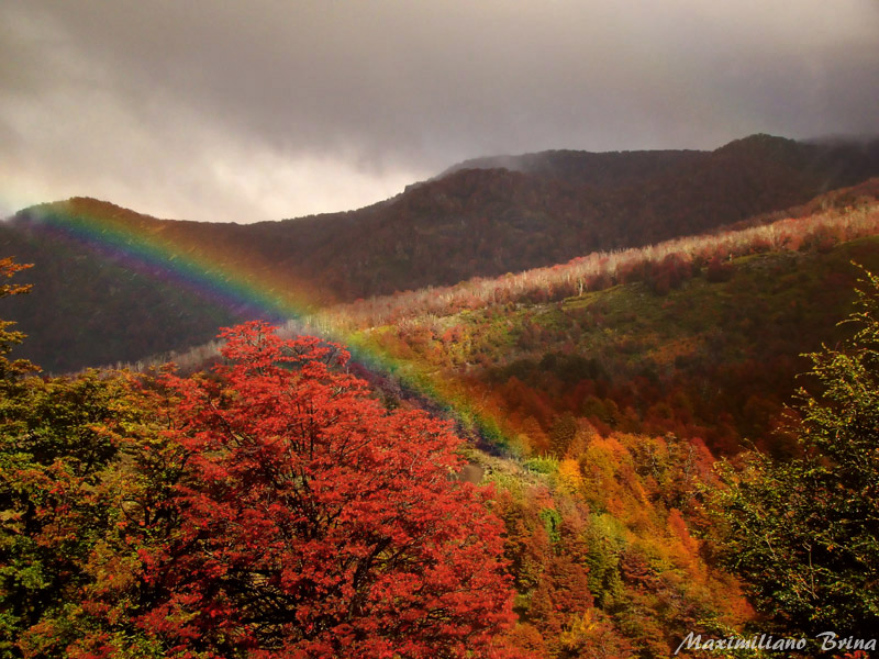 Usé esta imágen para ilustrar un trabajo que estoy escribiendo y ya que estaba se me ocurrió aprovechar una pausa para compartirla, darle algo de color a este día tan gris y, quizá, conjurar a los elementos para que nos dejen mañana hacer una linda salida. Hice esta imagen en Neuquén, en algún lugar de la RN 234 (la de los 7 lagos) el otoño pasado, no puedo precisar dónde pero no muy lejos del arroyo Partido. Un día raro en términos de luz con gruesos nubarrones por los que de tanto en tanto se filtraba el sol. Es un hdr a partir de tres tomas y posterior desaturación con PS, proceso que generó a su vez algunos detallitos no del todo deseados. La idea compositiva era jugar con la perspectiva que introducen las lineas "físicas" de la escena y las generadas por la luz. En un momento pensé en recortar y re-encuadrar centrando en la convergencia del arco iris y la ladera pero me pareció que quedaba muy apretado todo -ya la había apretado al hacerla para dejar fuera un cerco- por lo que opté por dejarla así y que cada espectador haga su camino.