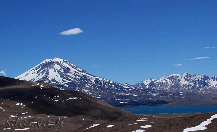 Vista del Volcán Maipo, al descender de Paramillos 3700 msnm., a la Laguna del Diamante en la prov. de Mendoza.
