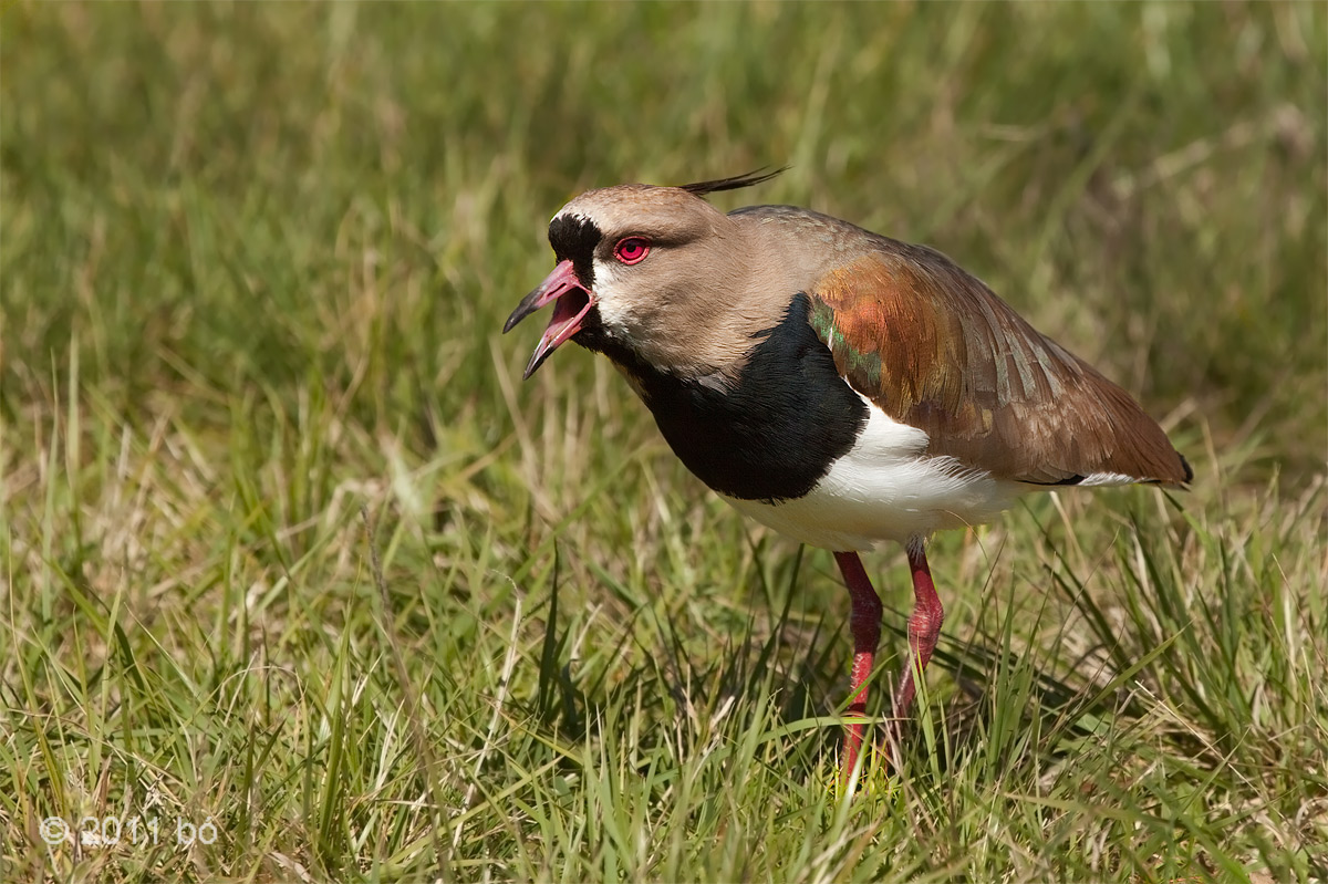 El copete erizado, los grandes ojos color rojo sangre y los espolones en la parte más adelantada de las alas lo convierten en una máquina de guerra capaz de enfrentarse a todo lo que signifique una amenaza para sus polluelos o huevos.
