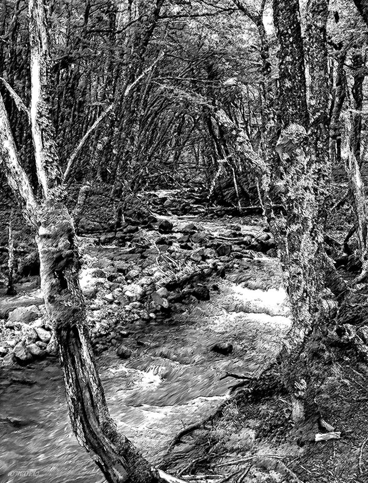hermosas escena que hace recorrer el arroyo y ver como se cierran los árboles. Me gusta como queda el blanco y negro. No me cierra el granulado.