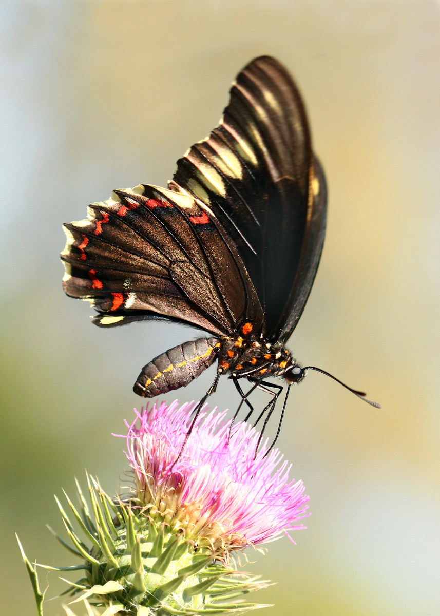 | | Sí la pérdida de foco en la punta de las alas la noté al hacer la toma, me dí cuenta que se debía a que ésta especie permanentemente bate las alas manteniéndose en movimiento la mayoría de las veces, por lo que dobla las alas hacia afuera necesitando mas profundidad de campo que otras mariposas que se posan quietas y no requieren cerrar mucho mas el diafragma, así que lo cerré más, pero como nunca se me dieron las demás condiciones que favorecieron ésta toma, no quedaron mejor que ésta. Debí aclararlo arriba pero como es de archivo me olvidé de hacerlo. Gracias por comentar!!! |