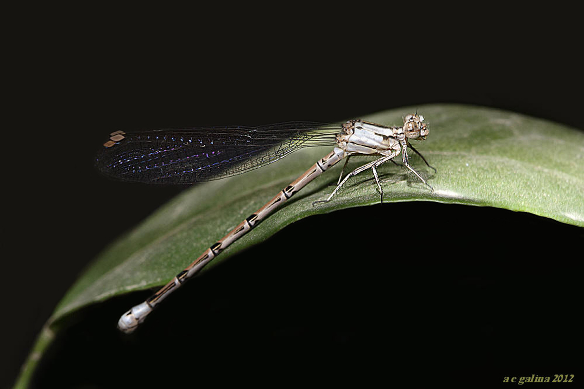 Muy linda la Libélula. Creo que te quedó un lindo efecto entre el tramo recto de su cuerpo y la parábola que describe la hoja. Complicado el contraste de las alas transparentes contra el fondo negro, pero ese reflejo violáceo las destacó.