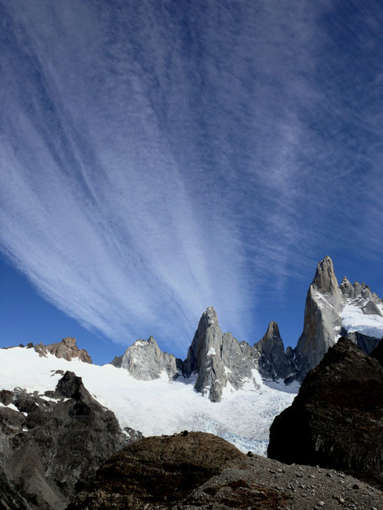 La imagen esta tomada, desde la Laguna de los Tres ,en El Chalten ,estos picos se encuentran a la izquierda del Fitz Roy; se imaginan que le dispare muchas fotos a este cordon montañoso tan fotogenico, pero en esta, el protagonista fue el cielo.