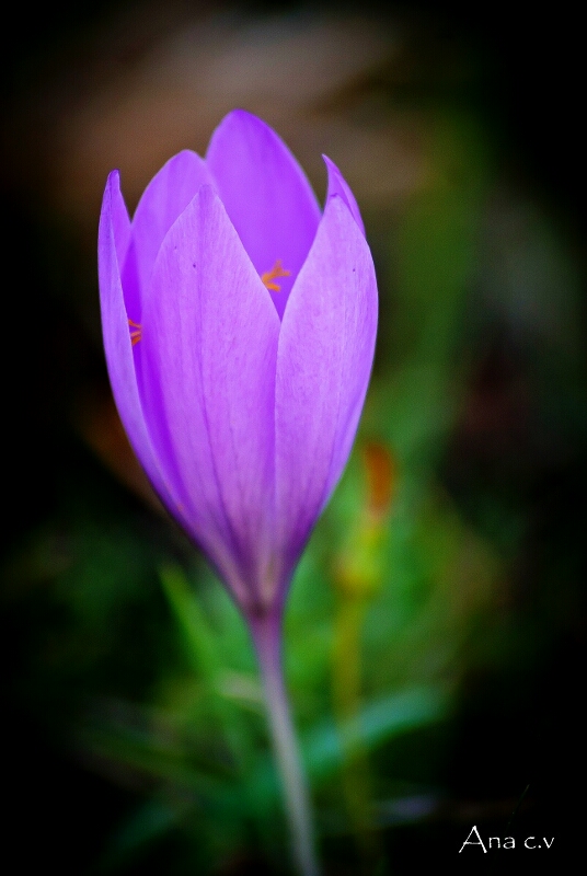 Hermoso colore y forma de esa florecilla, sus estambre anaranjados y el verde y negro del fondo hacen que se destaque aún más, felicitaciones!