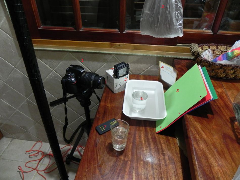 1) Camara con lente 18-55mm y tripode.2)Bolsa de plastico perforada sostenida de un gancho para jaulas de canarios(como aves en cautiverio no tengo lo utilizo para esto jajaja).3)Mini reflector, ya que no tengo flash externo.4)Papel plateado para febotar la luz.5) Cartulinas para hacer un fondo de color deseado.6) Baso con agua hasta el borde, y bandeja abajo para receptar el agua que cae.7) Control remoto.