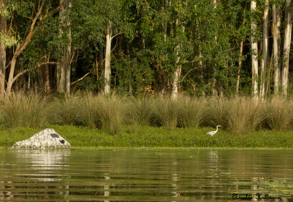 | | supongo que con su metro noventa iria casi cuerpo a tierra ya que estaria a 1,5 metros de la orilla y no tendria mas que 70 cm de agua por alli. Si bien el lago de Salto Grande gana en profundidad en esta zona, ese dia pudimos movernos de un lado a otro caminando y en otras propulsando con patas de rana en las zonas mas profundas (de 2-3 metros) |
