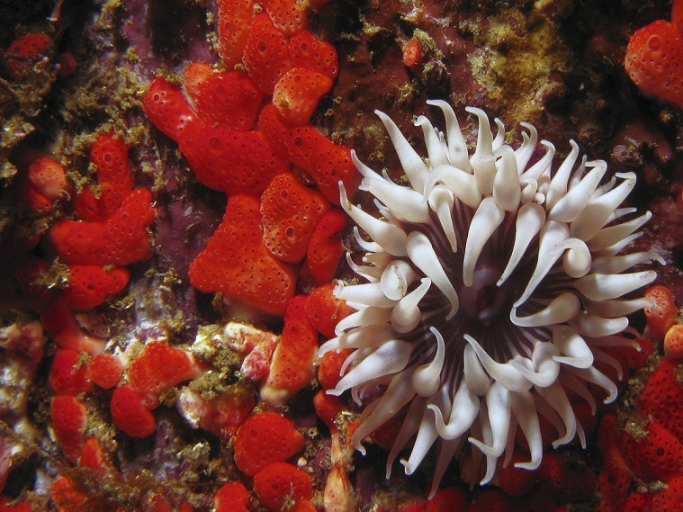 . Las anémonas de mar o actinias (Actiniaria) son un orden de antozoos hexacorales. Son animales que se fijan al substrato marino, ya sea la arena del fondo o en el caso de las actinias, las rocas. Llegan a medir desde 1.5 cm hasta 2 m de alto. Estos pólipos, parecen más bien una colorida planta que un animal propiamente dicho. Hay más de 800 especies. Esta foto fue realizada en la Reserva de Biósfera Marina de Arvoredo en Brasil.